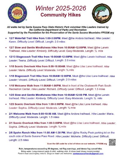 For a complete schedule of hikes in the Santa Susana Pass State Historic Park, visit fpssm.org, or email santasusanafriends@gmail.com.